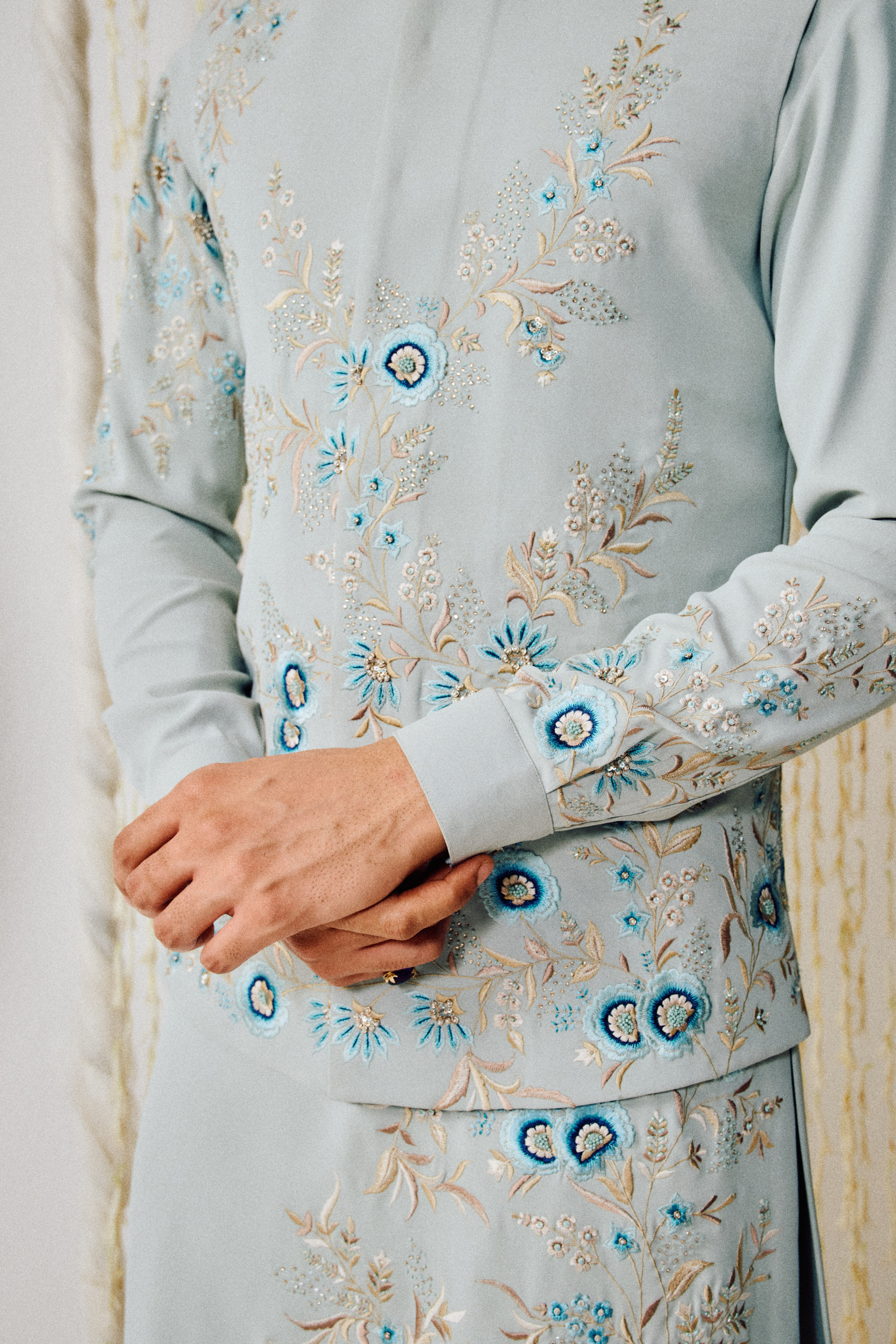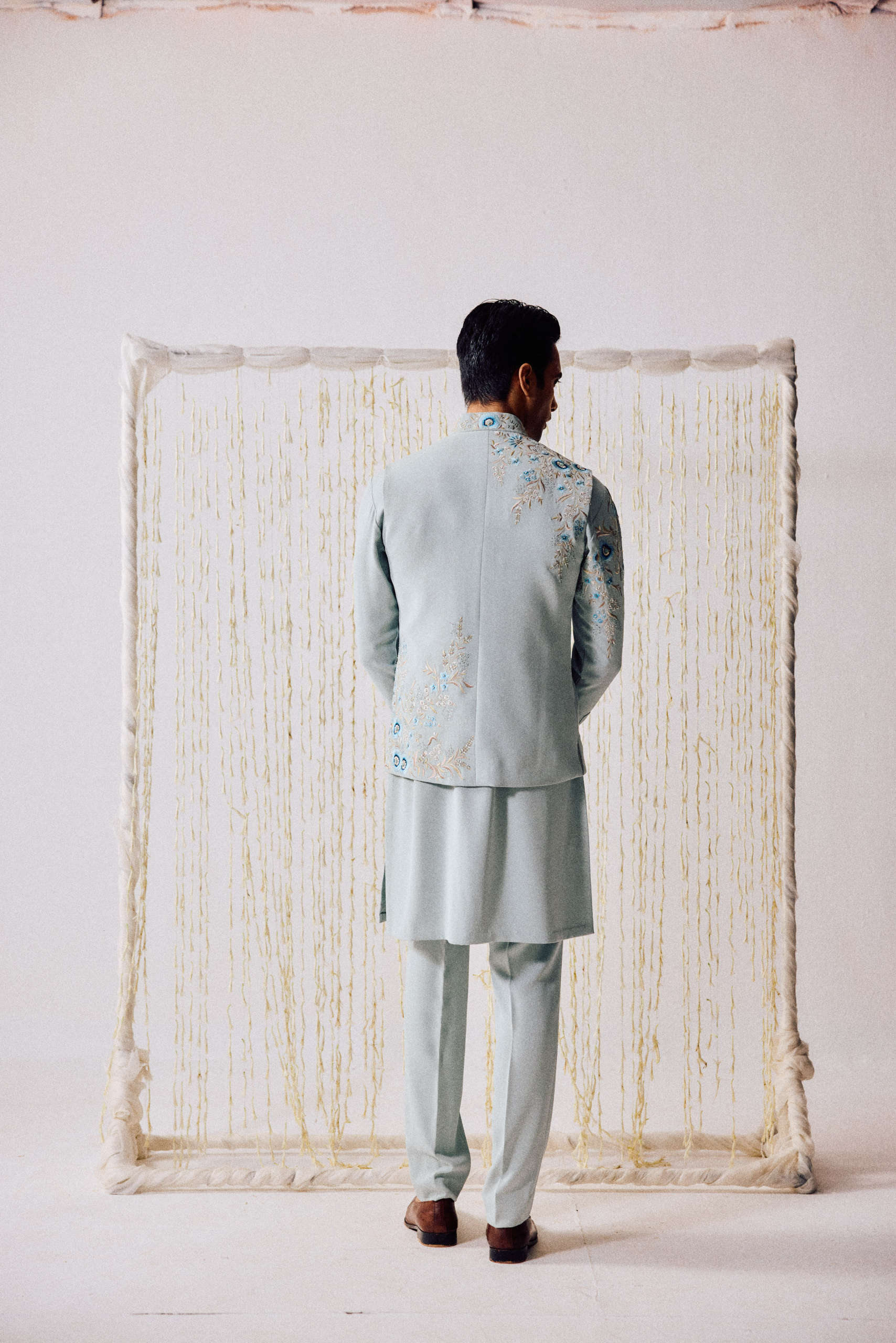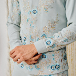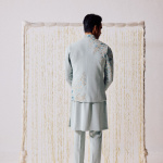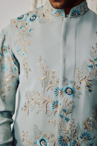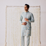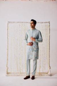 Where elegance meets emotion. This powder blue waistcoat kurta set radiates calm — adorned with delicate floral