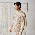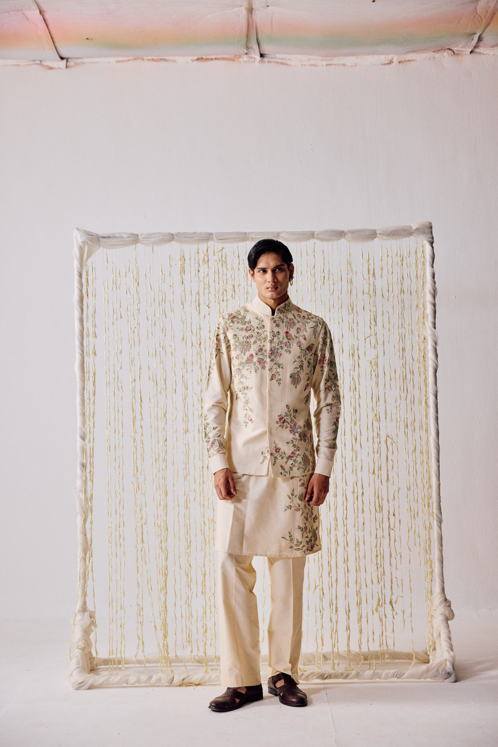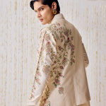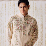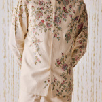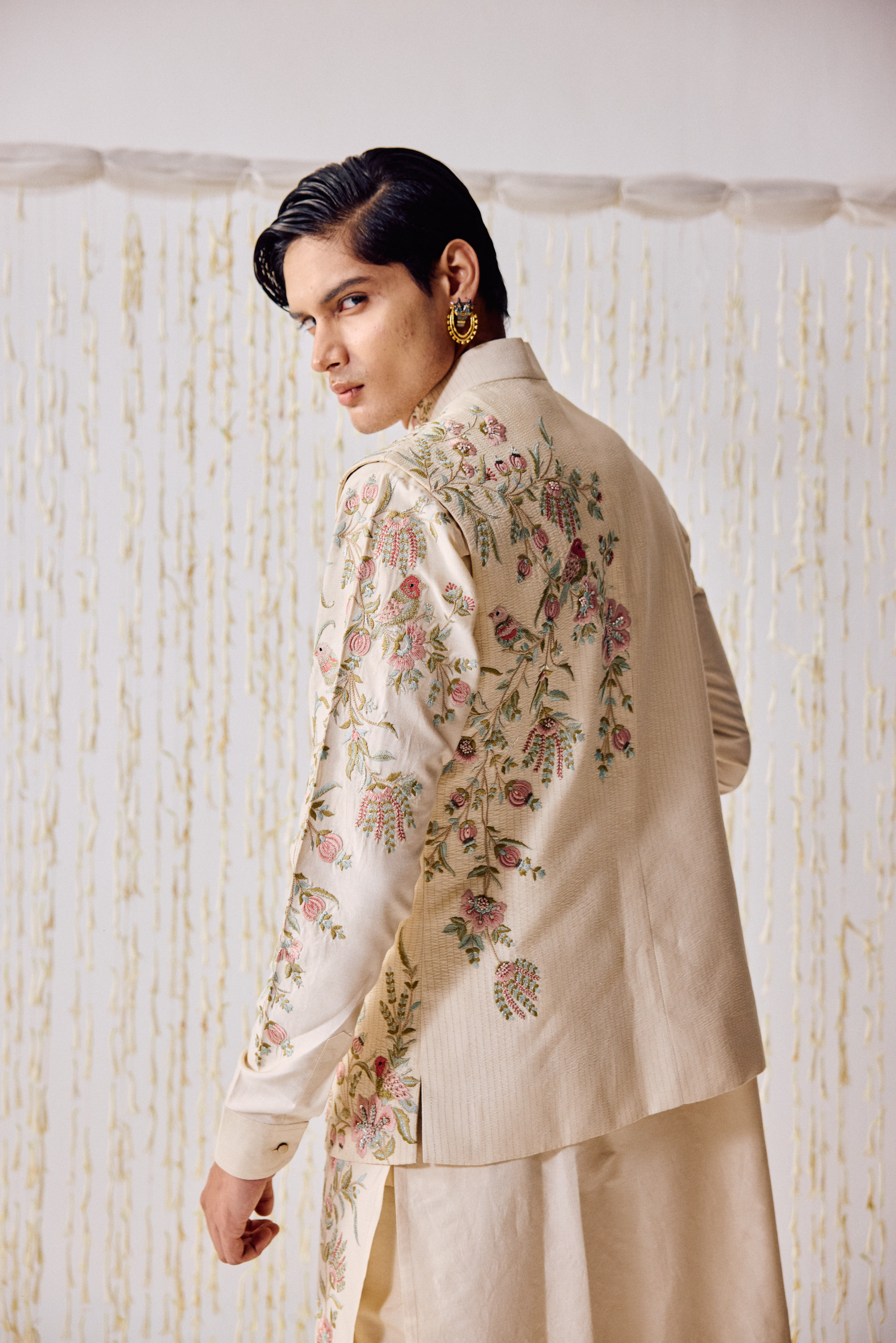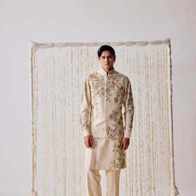 cream-colored waistcoat kurta set is adorned with intricately embroidered birds fluttering gracefully amidst floral