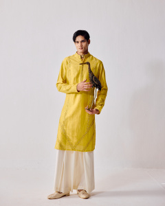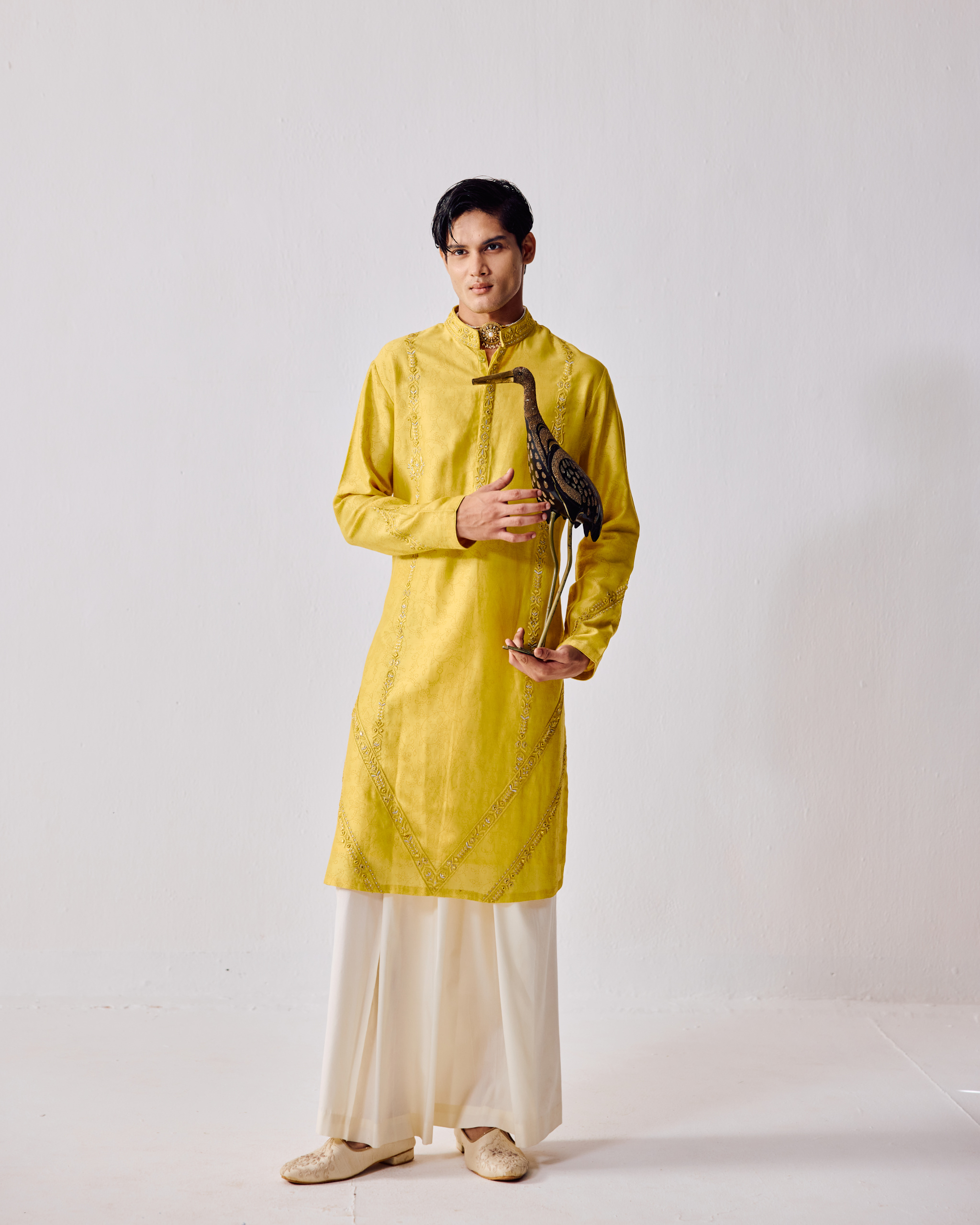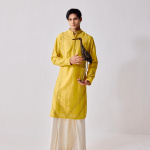 yellow embroidered kurta glows with warmth, adorned with exquisite leather appliqué work