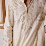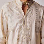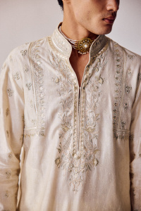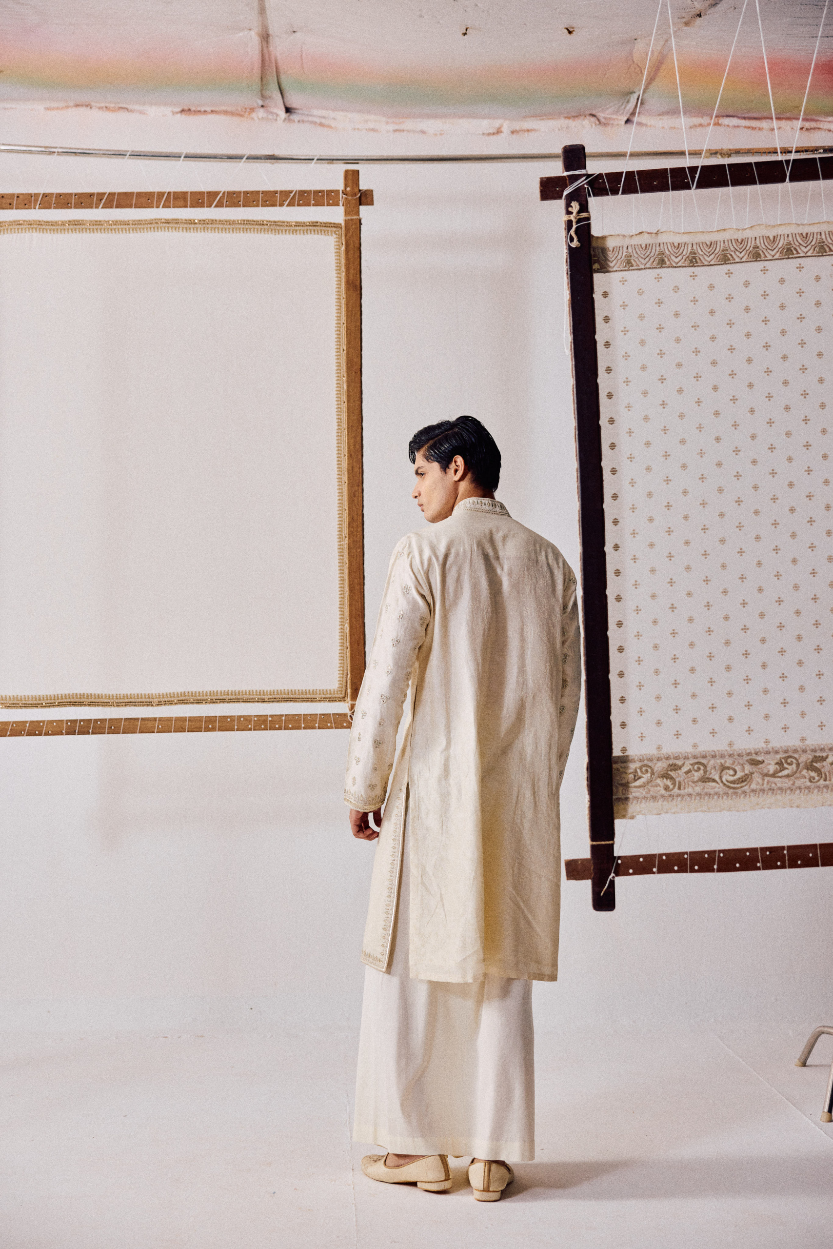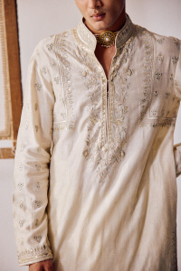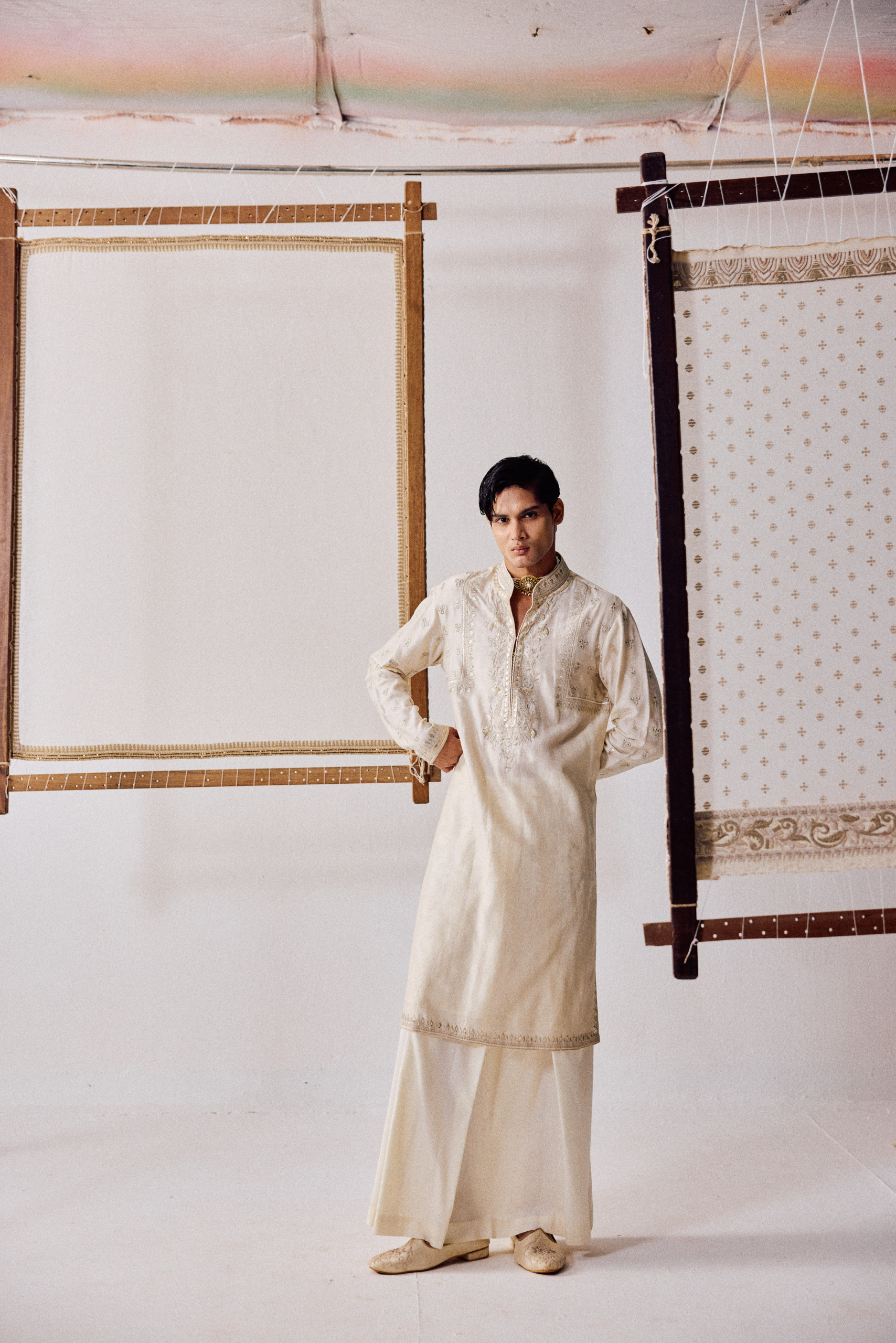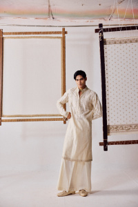 refined elegance. This off-white embroidered kurta, paired with an elegant pleated dhoti,
