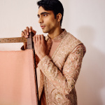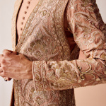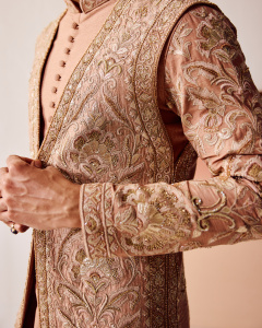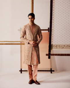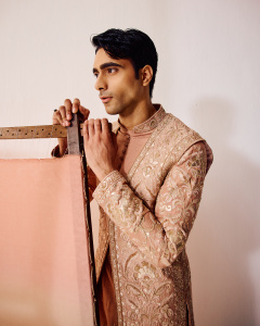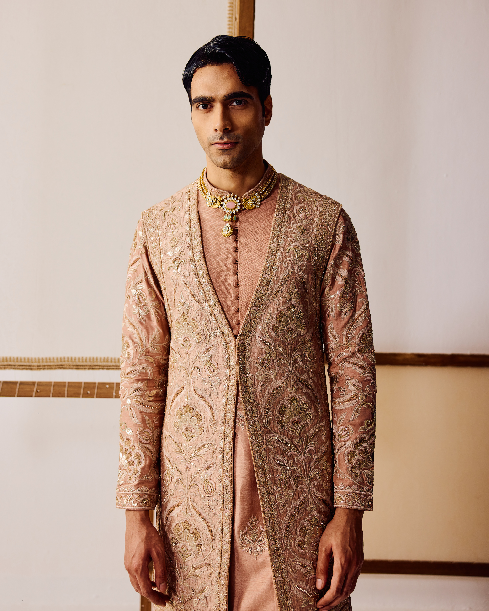 Zohra redefines blush for the modern man. The structured cape, finished with gleaming gold accents, creates a